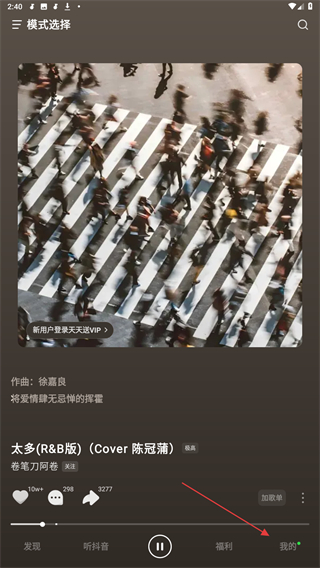 1、处于抖音音乐的歌曲播放页面时,点击底部导航栏的我的选项。