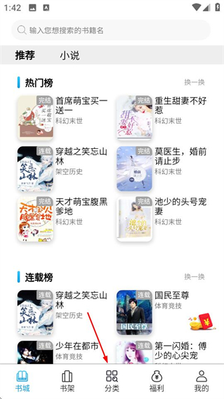 1、在书城页面点击底部分类选项,进入分类页面。