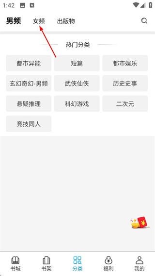 2、在分类页面选择女频标签,切换到女频分类列表。