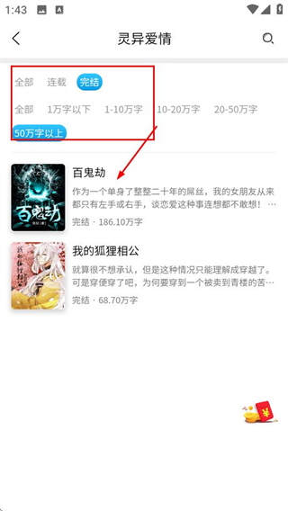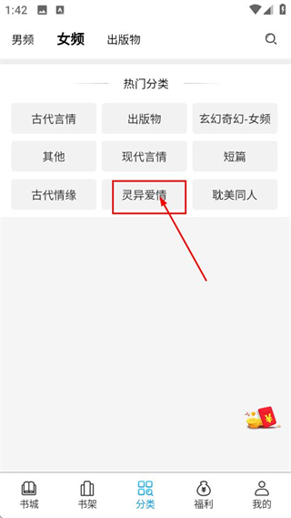 3、在女频分类中选择灵异爱情选项,进入对应小说列表页。