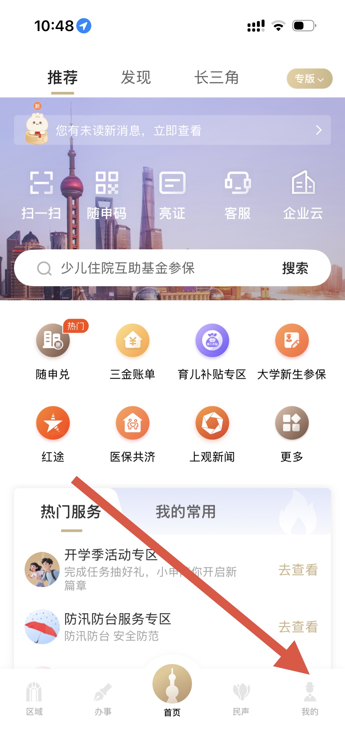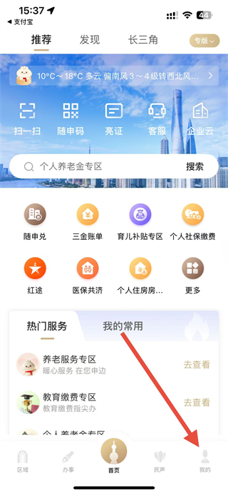 1、在随申办市民云首页,点击右下角我的选项,进入个人界面。