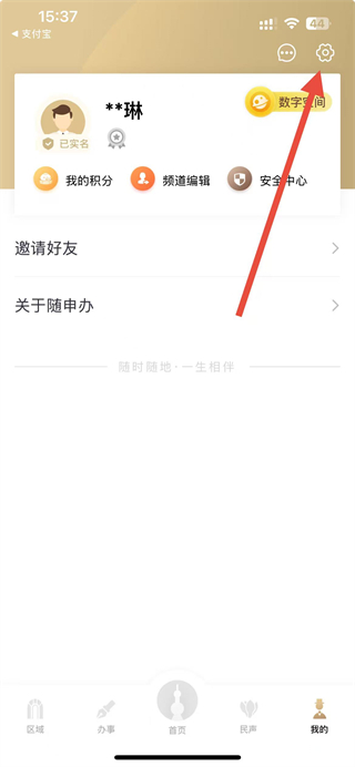 1、打开随申办市民云APP,在我的页面点击右上角设置图标。