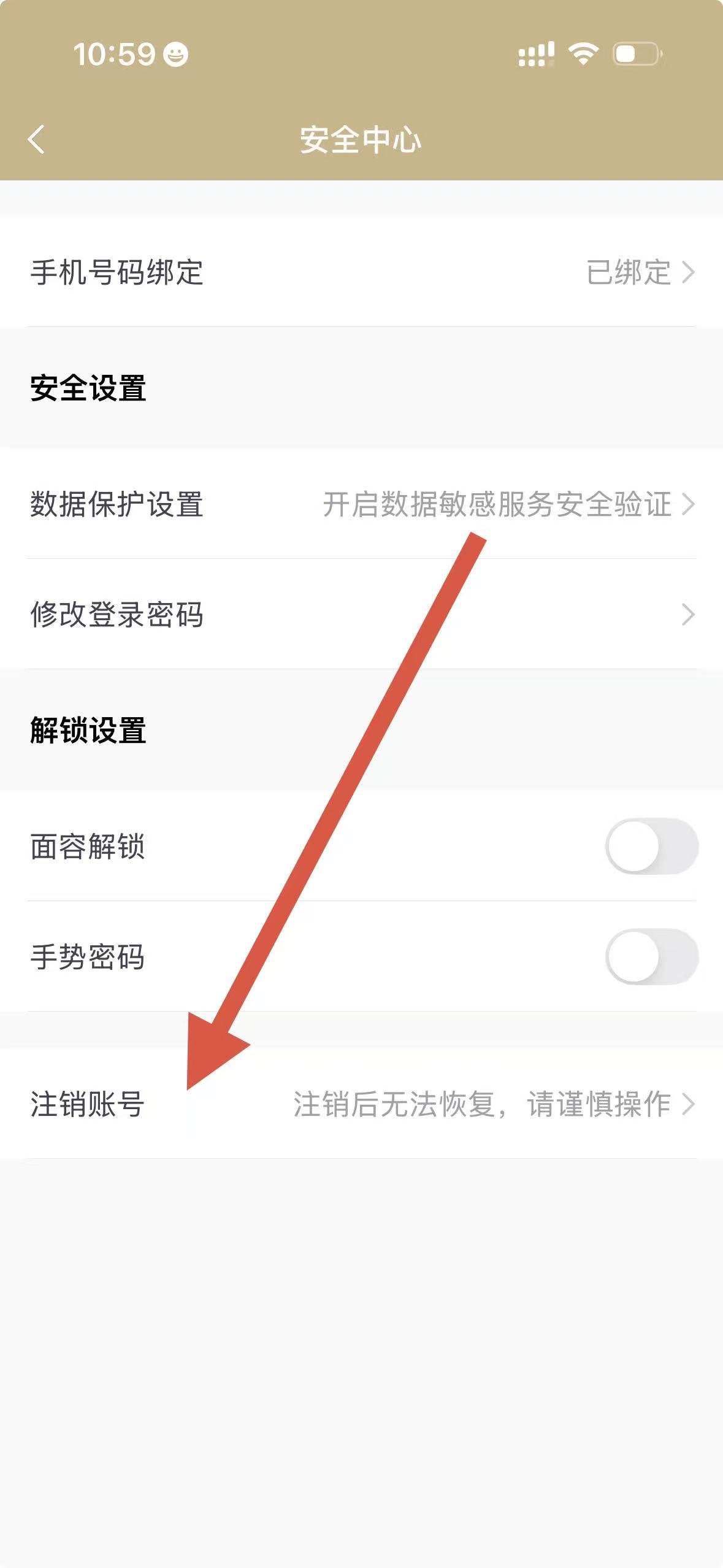4、在安全中心界面中,找到并点击注销账号选项,按照提示进行后续操作。
