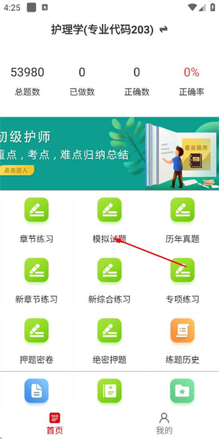 1、在首页点击模拟试题选项,进入模拟试题分类页面。