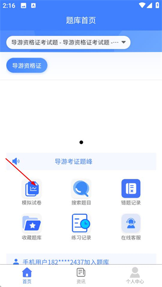 1、在题库首页点击模拟试卷选项,进入模拟考试页面。