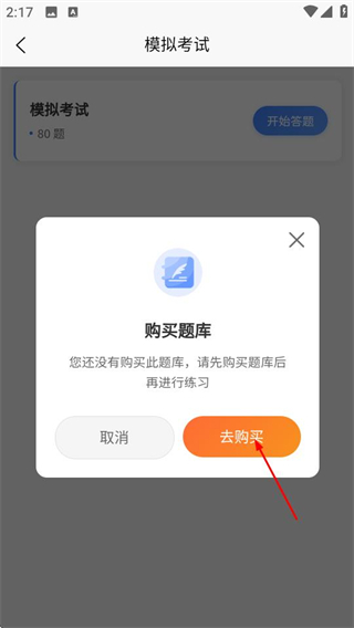 2、在模拟考试页面点击开始答题按钮,触发购买题库弹窗。