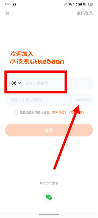 3、在密码登录页面,输入手机号,点击获取验证码。