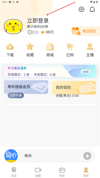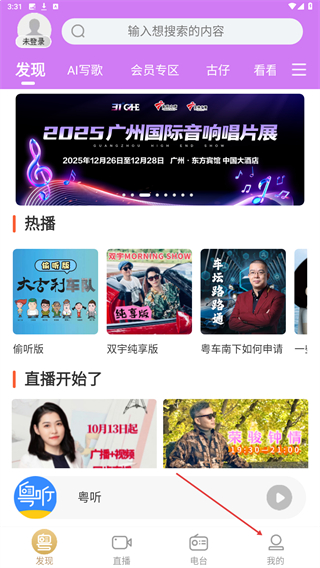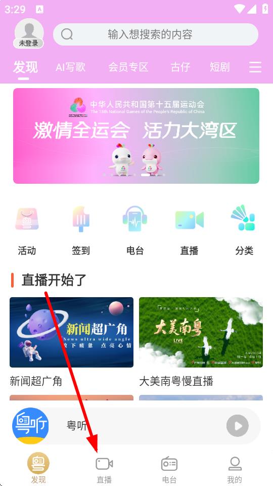 1、打开粤听app,点击底部导航栏中的直播选项。