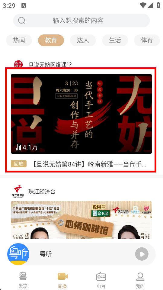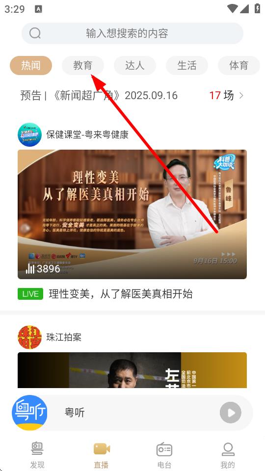 2、进入直播页面后,上方会显示热闻、教育、达人等分类标签,可点击相应分类,如教育筛选直播内容。
