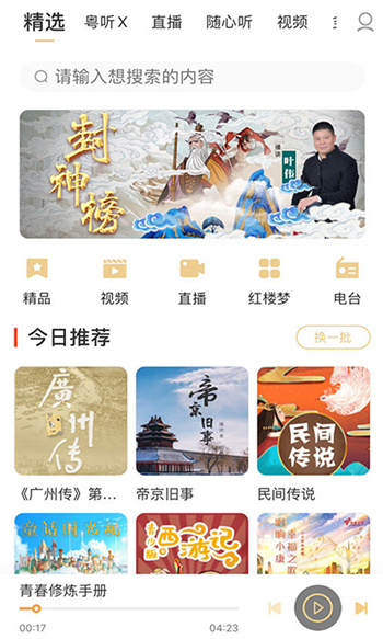 粤听app又称粤听fm,是一款内容全部为粤语播报的手机电台软件,这款电台app每天都会通过粤语,融合了情感故事、社会热点、即时新闻、动听音乐等多种类型节目,闲暇时,沉浸在情感主播温柔讲述的故事中,通过简短新闻快速了解天下事;想听音乐放松,也能找到适配不同情绪的歌单。