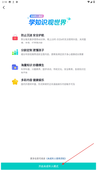 4、进入该页面内,点击下方开启未成年人模式即可。