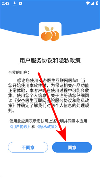 1、打开安杏医生,在弹出的弹窗中点击同意,进入登录注册页面。