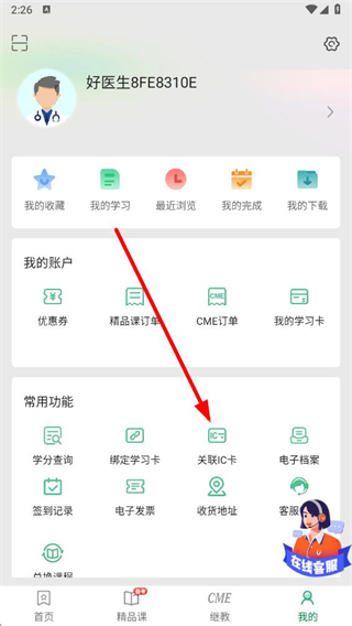 2、在我的页面中,下滑找到常用功能板块,点击关联IC卡选项。