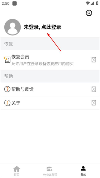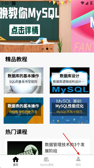 1、在MySQL数据库宝典首页点击底部我的选项,进入个人页面。