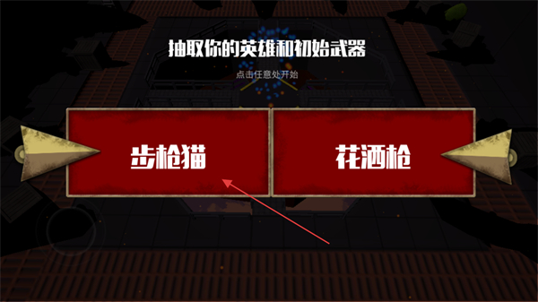 1、点击任意区域抽取初始英雄和武器,选择步枪猫和花洒枪的组合开启游戏。