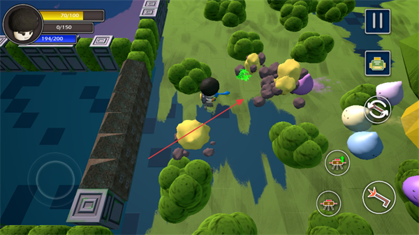 2、操控角色移动左侧轮盘,靠近怪物区域,用花洒枪攻击敌人积累资源。