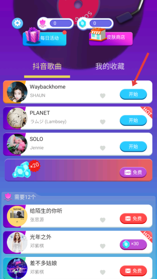 1、在游戏中,选择一首自己喜欢的歌曲,点击开始按钮,开启音乐游戏之旅。