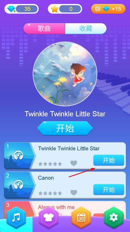 1、进入游戏后选择喜欢的动漫曲目,等待前奏结束,屏幕将出现下落的钢琴块,准备跟随节奏点击。