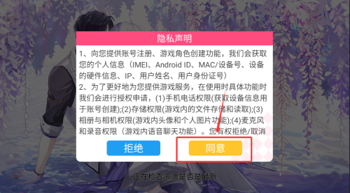 1、首次启动需阅读并确认用户协议,完成授权后进入游戏主界面。