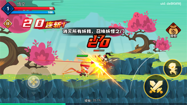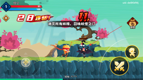 1、操控左侧移动键控制悟空移动,攻击妖精触发6连斩!,推进消灭妖精的进度。