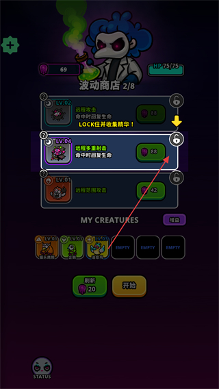 3、进入波动商店,消耗资源解锁/升级技能如变异野兽角色,增强战力。