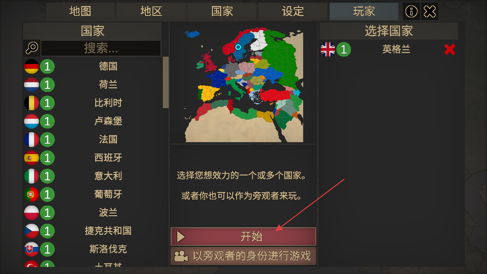 1、在国家列表中挑选想要执掌的国家,选定后点击界面中的开始按钮,即可进入对应势力的发展流程。