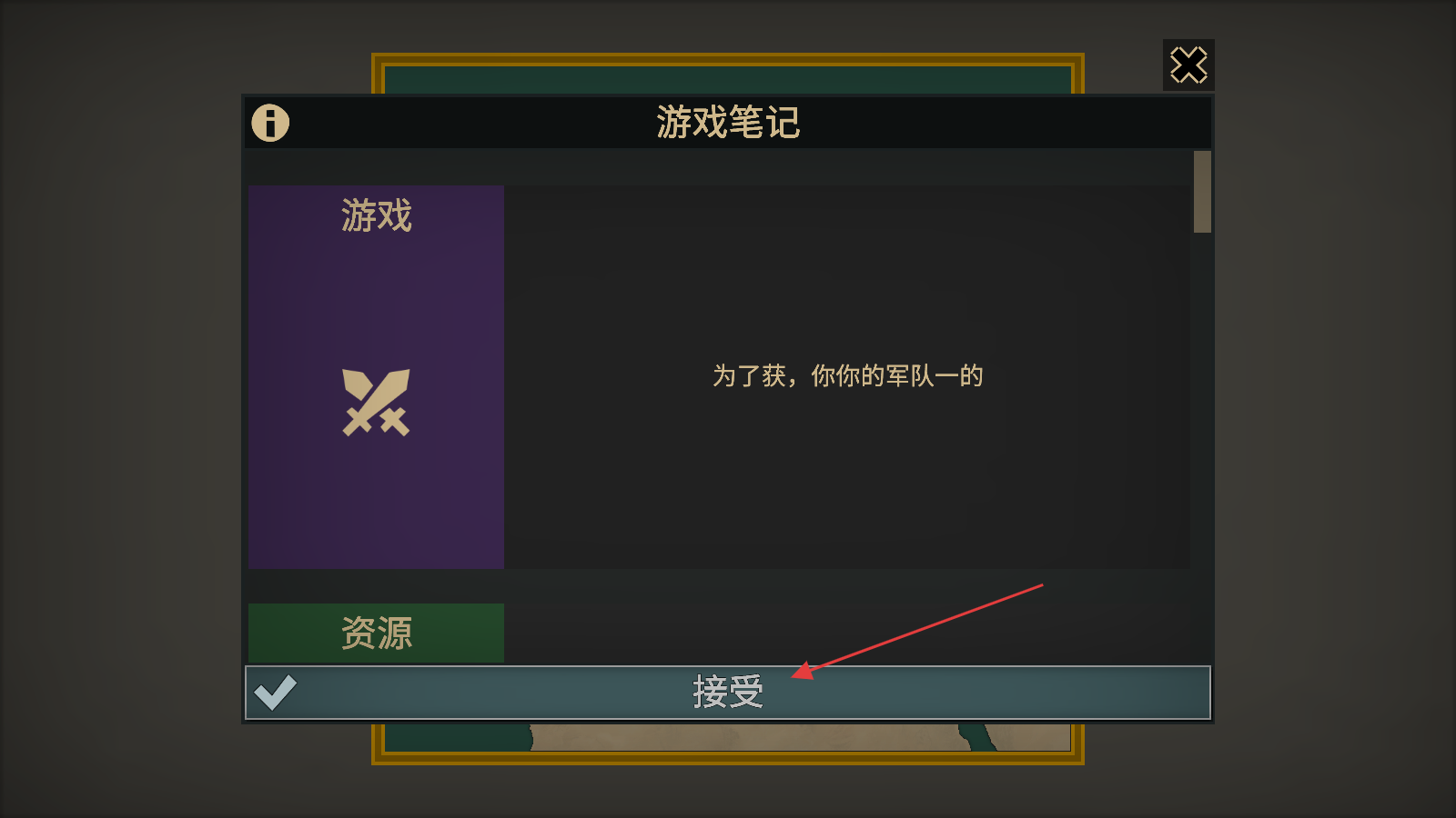2、进入游戏后会弹出游戏笔记界面,点击接受按钮即可查看基础玩法说明,了解核心目标与操作逻辑。