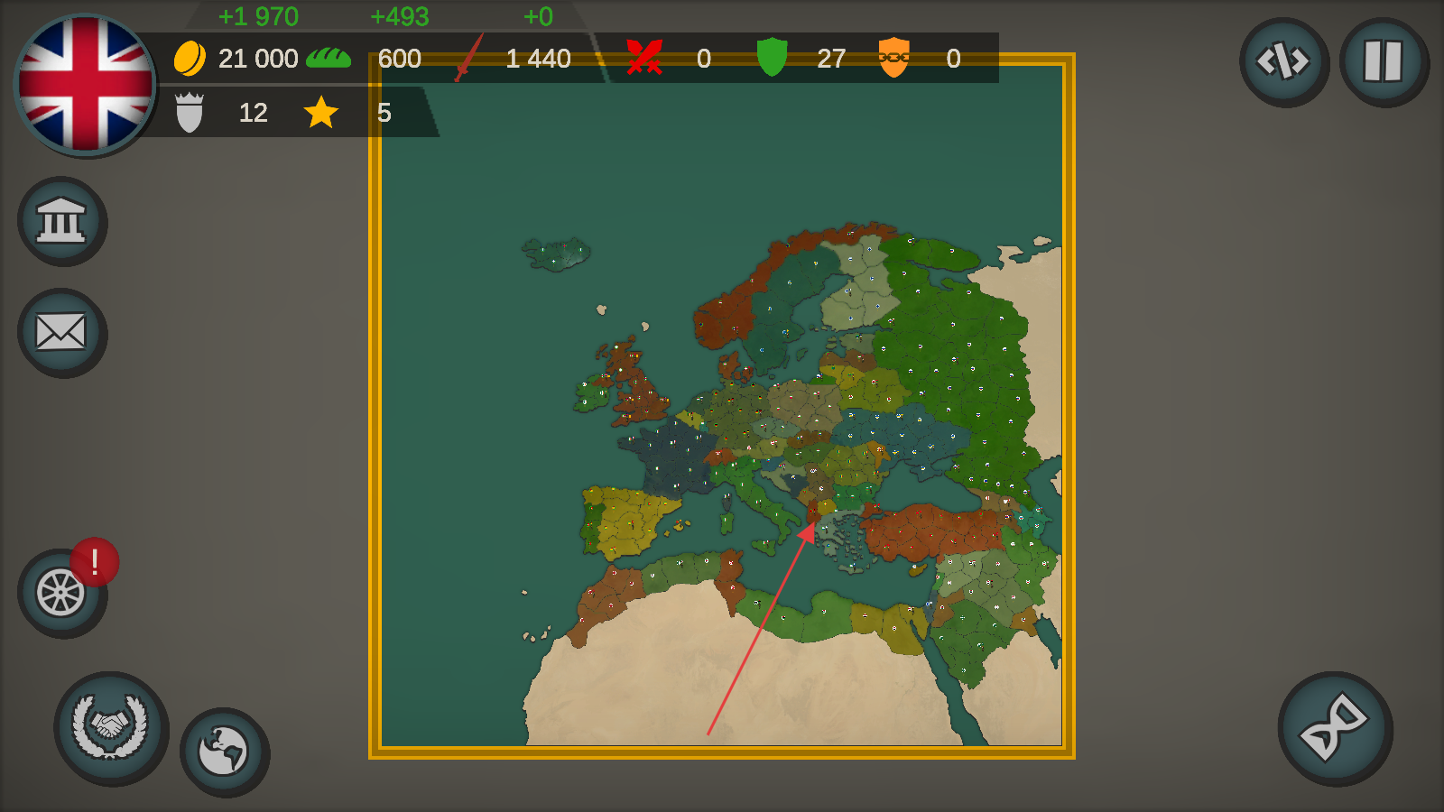 1、资源军队强化:通过完成各类任务获取金币,用金币采购强力武器装备,强化防御系统提升国家实力,逐步缩小与他国差距甚至实现全面超越。