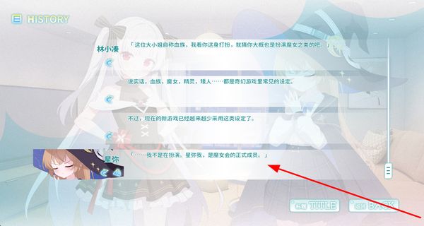 4、借助历史功能,查看之前的剧情对话内容,回顾角色之间的交流信息,也能通过返回按钮回到之前的界面。