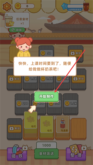 1、根据提示点击开始制作,准备制作奶茶,消耗对应食材。