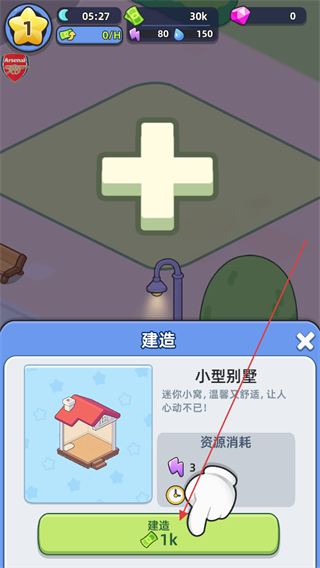 2、选择小型别墅,消耗3紫色资源与1k金币,点击建造完成建筑搭建。