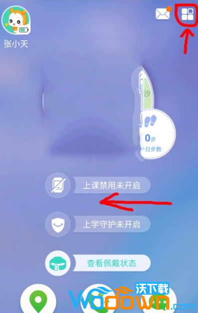 打开 小天才电话手表APP,点击右上角图标或左滑进入功能页。