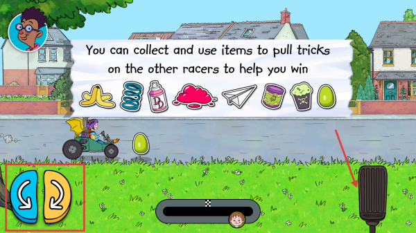 3、进入比赛场景后,通过屏幕左下角的转向按钮控制卡丁车方向,收集道具,利用道具干扰其他赛车手,争取率先冲过终点获胜。