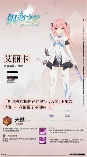 3、艾丽卡自身的技能特点是【点杀爆发】,从她的技能点能看出来,她是一枚妥妥的卖血成员,以自身血量为核心去输出伤害,并且是点杀式、不断增长,最后能达到爆发输出的伤害量。在阵容搭配上,艾丽卡适合走后期输出流,前期掉血储能伤害,后期给她一个奶妈,她便能提供更强的伤害;当然也可以搭配同样有卖血能力的队友,如忒路安,走极致爆伤流。而在“助战”上,她的技能特点是【复活反攻】,即为之助战的伙伴提供概率复活并追加普攻的效果。词条比较适合普攻伤害高的伙伴,如配合主角本身的单体输出。