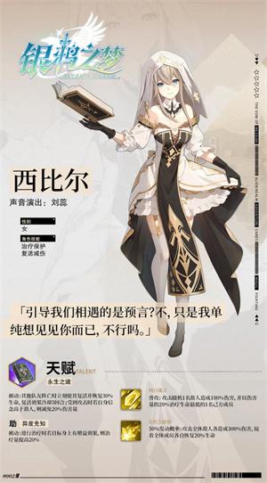 5、西比尔的技能特点是【治疗保护】和【复活减伤】,在她每次攻击时都可以恢复造成伤害一定百分比治疗效果治疗我方角色,可以很好地抬起我方角色的血量;她的被动技能“永生之谶[chèn]”则可以使得我方已经阵亡的角色立即复活,在战斗中打出出其不意的效果;其必杀技“异度先知”则是全体伤害+全体回血的效果,在战场中压低敌方血线的同时还可以较大幅度的治愈我方单位,在配合被动复活拉出普攻+大招则可以瞬间逆转场上的局势从而获取战斗的胜利,这是一名兼顾输出和治愈的强力角色,特别是在模拟战中,在合理的阵容搭配下有她的存在则可以使得小队以一抵十哦。