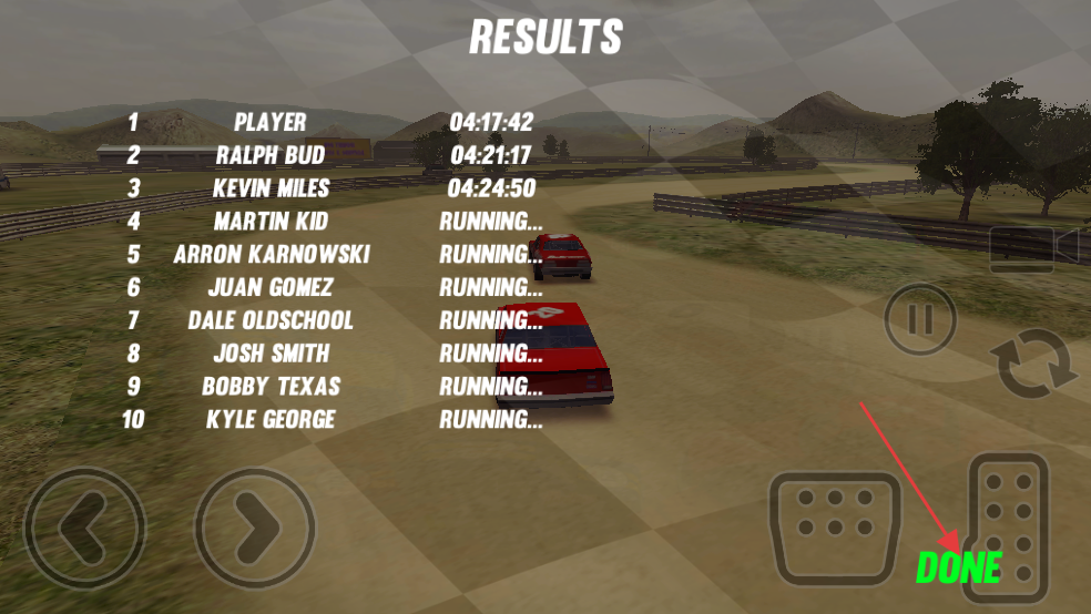 4、比赛结束后,界面显示排名等结果,点击绿色的“DONE”按钮,即可进行下一场比赛。