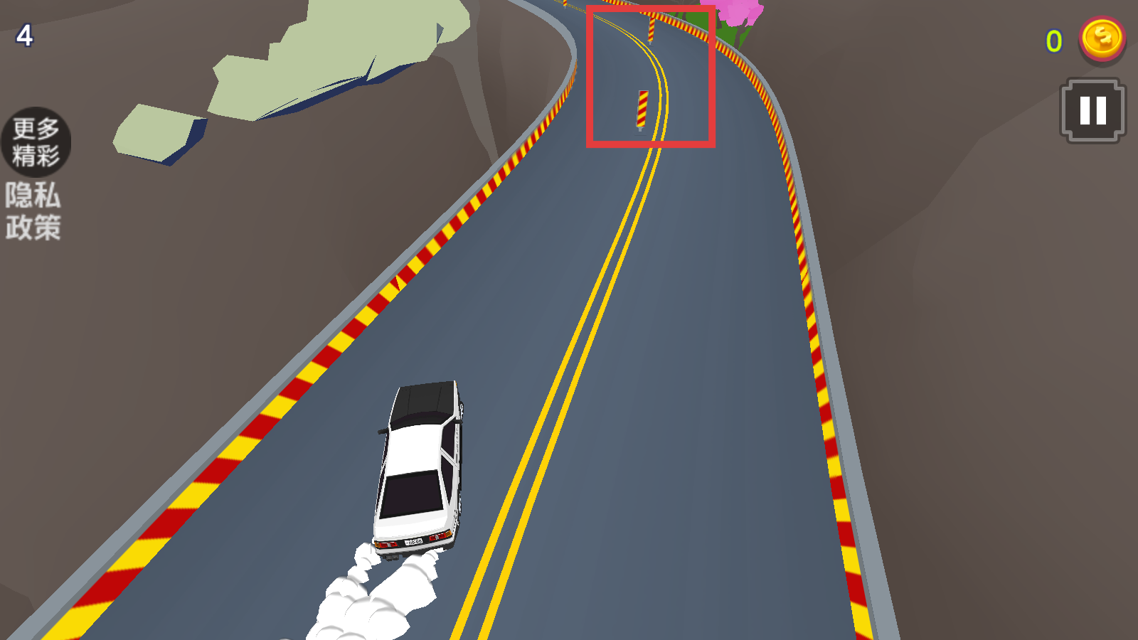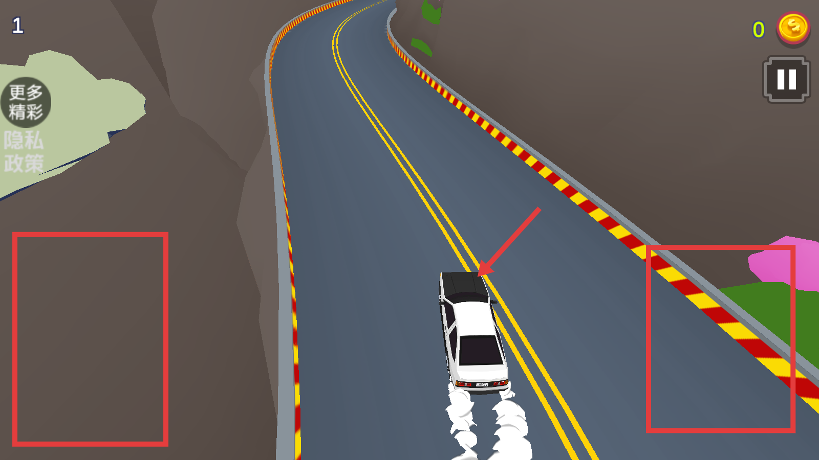 2、左右点击屏幕在弯道上操控汽车漂移,避免碰撞两侧护栏。