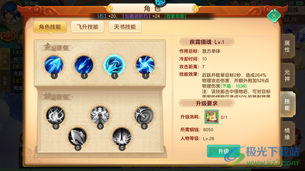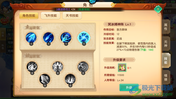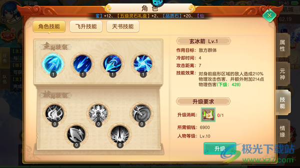 1、玄冰箭:对身前扇形区域的敌人造成210%物理攻击伤害,并额外附加214点物理伤害,技能伤害随等级提高而提高。