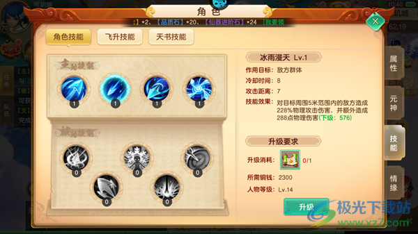 2、冰雨漫天:对目标周围5米范围内的敌方造成228%物理攻击伤害,并额外造成288点物理伤害,技能伤害随等级提高而提高。