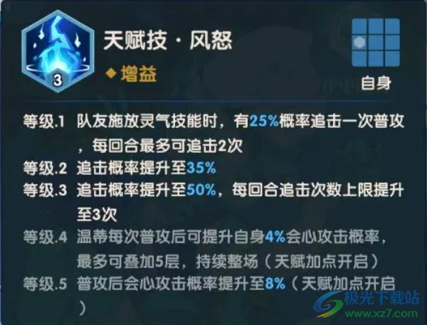 队友施放灵气技能时,有2概率追击一次普攻每回合最多可追击2次。