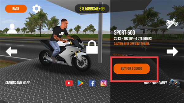 1、利用无限金币,点击【BUY-FOR-$35000】购买【SPORT-600】摩托,提升竞速性能。