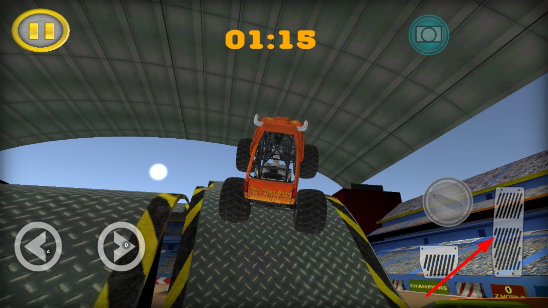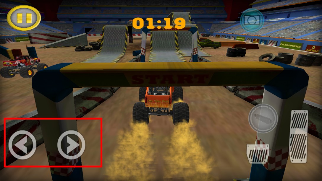 2、点击右侧油门按键,能让橙色怪物卡车加速,在赛道上行驶。