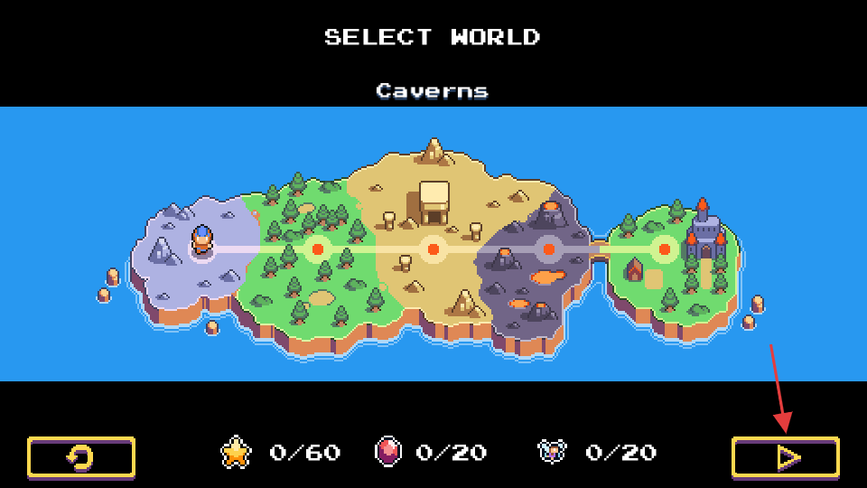 2、在世界选择界面,查看不同区域,点击如箭头所指的播放按钮,确认进入游戏关卡。