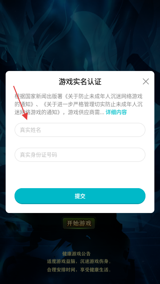 1、在游戏启动界面,点击【开始游戏】按钮,进入游戏实名认证界面。