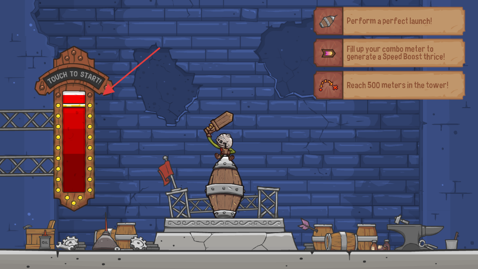 2、在游戏准备界面,点击【TOUCHTOSTART!】开始游戏,上方提示栏给出游戏目标,如完美发射、积攒连击数获取加速、到达500米高度。