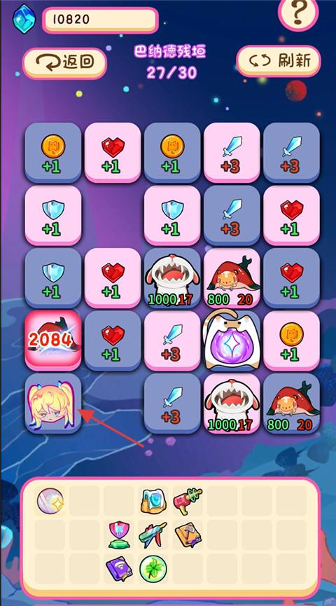2、在游戏关卡界面,通过消除方块获取资源和应对怪物,可点击如箭头所指的角色头像,可能触发角色技能,助力关卡推进。