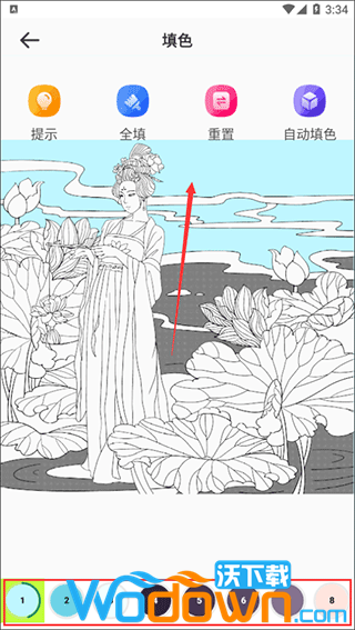 开始填色选择完成后,您将看到一幅无色的线稿图,您可以选择下方的调色板为对应的区域填充颜色。同时,可以通过双指缩放来调整图片的大小,更精确地进行填色。