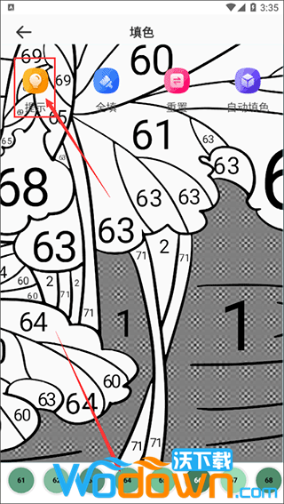 使用提示功能如果您需要帮助,可以点击“提示”按钮,APP会在相应的区域显示对应的颜色数字,帮助您快速填充颜色,避免填错。