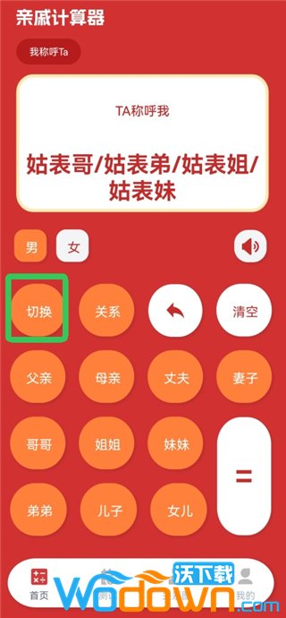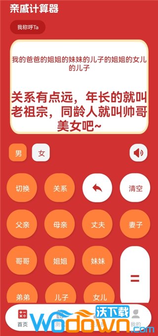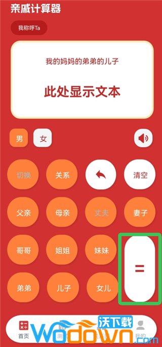 输入亲戚关系输入你想了解的亲戚关系,比如“我妈妈的弟弟的儿子”,点击【=】号即可看到正确的称呼。