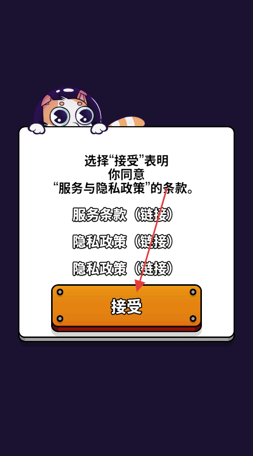 1、在服务与隐私政策提示界面,点击【接受】,同意相关条款,进入《嘭嘭火箭猫》游戏。